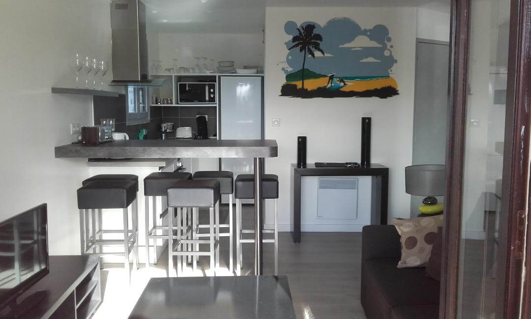 1 chambre avec 1 lit double donnant sur balcon. Pièce à vivre avec espace salon télévision et Wifi donnant sur balcon. Cuisine entièrement équipée ouverte sur le séjour avec four, four micro-ondes, plaques vitrocéramiques, cafetière Senseo, bouilloire, grille-pain. Salle de bains avec WC et lave-linge. Balcon-terrasse. Garage. 1er étage sans ascenseur. Wifi.