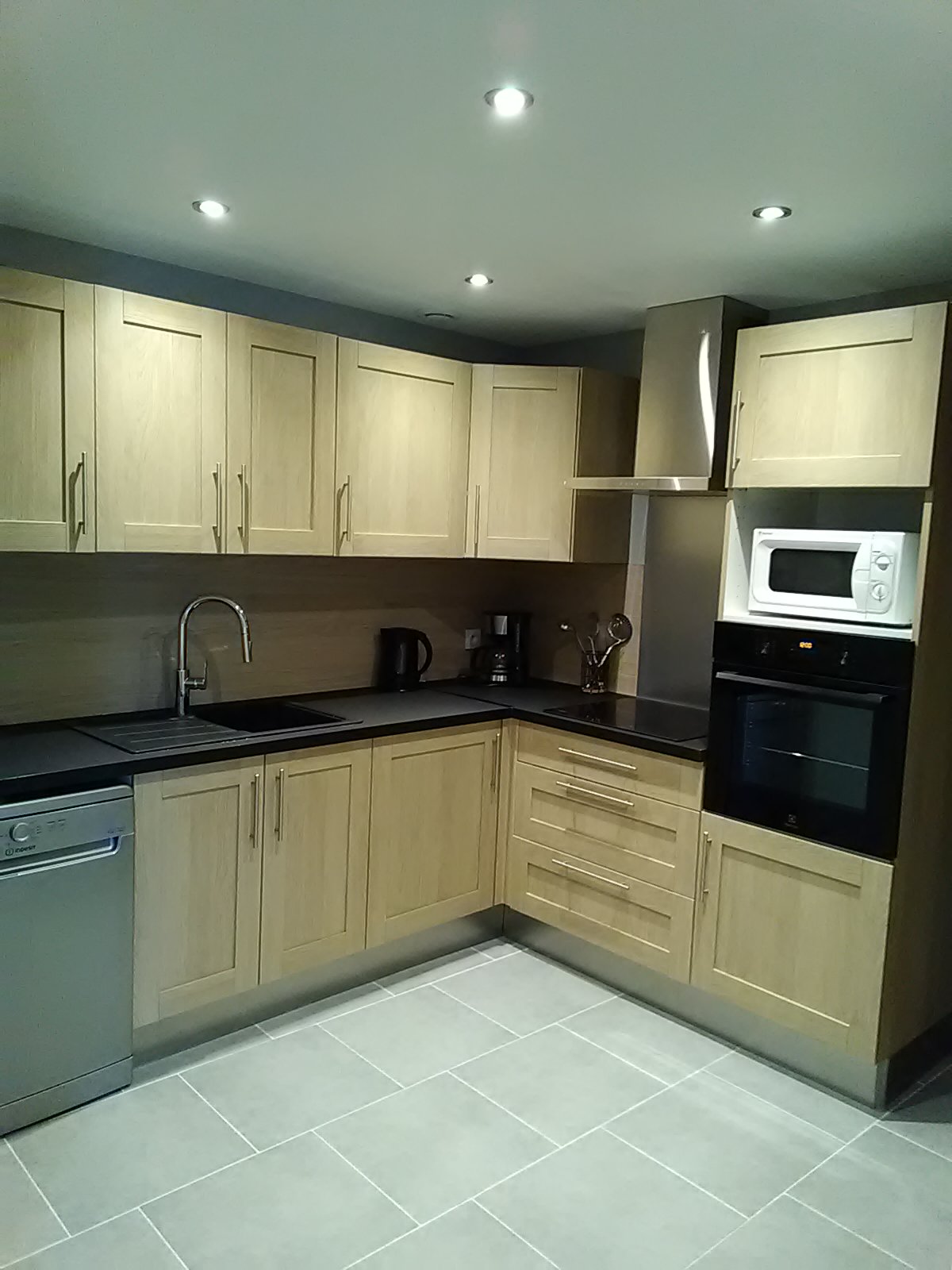 -Au rez de chaussée : une cuisine toute équipée (four, micro-ondes, plaque à induction, frigo, congélateur, lave vaisselle, cafetière, bouilloire et grille pain) ouverte sur le séjour ainsi qu’une salle de bain et un toilette séparé. Le logement est équipé d’un lave linge.
