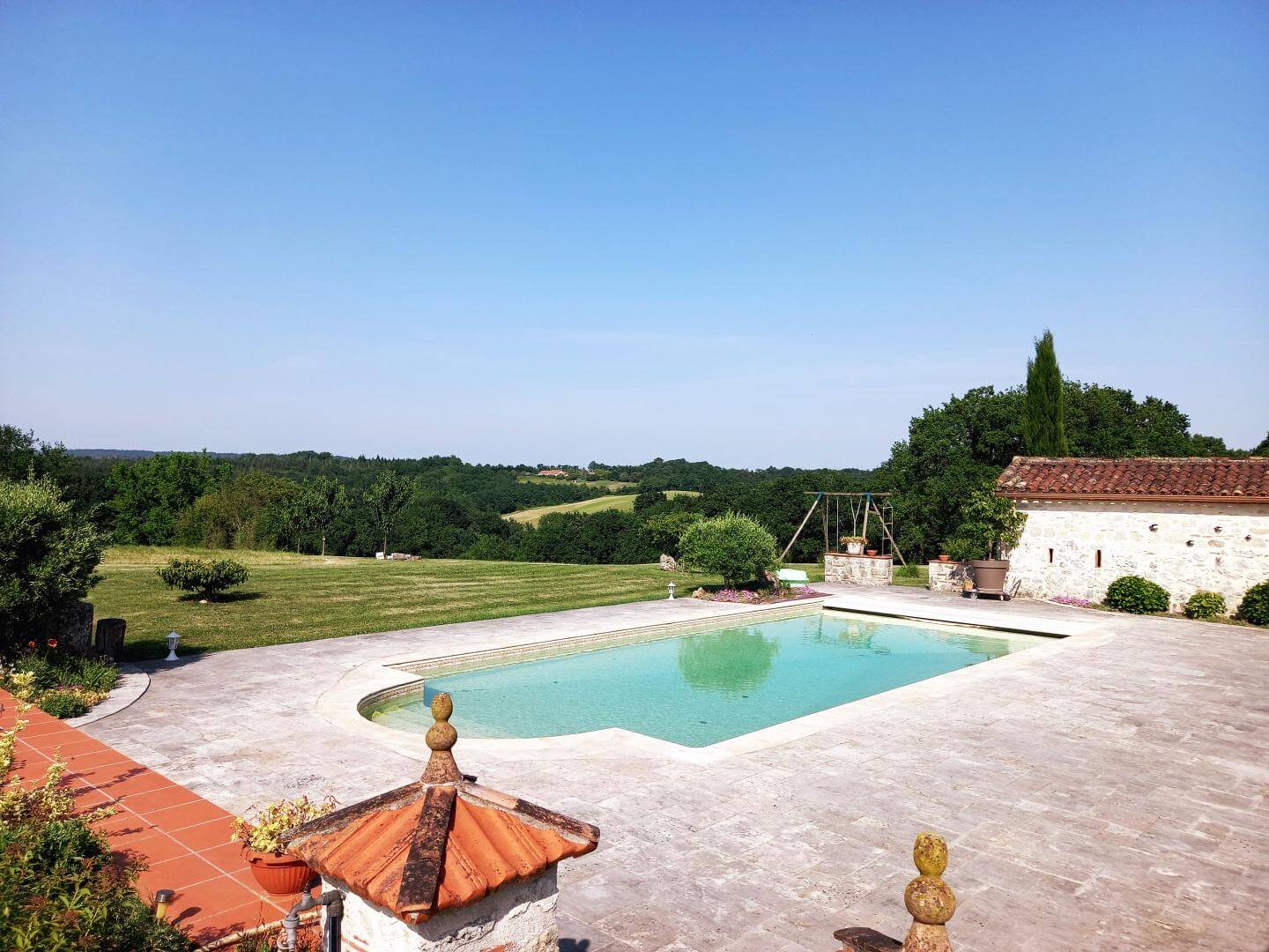 Une piscine commune avec les propriétaires de 12m par 5, une terrasse couverte et privative de 120m², avec salon de jardin, barbecue. Le gîte dispose d’une grande pièce de vie de 55m², avec cheminée, TV, cuisine équipée, 2 espaces repas.