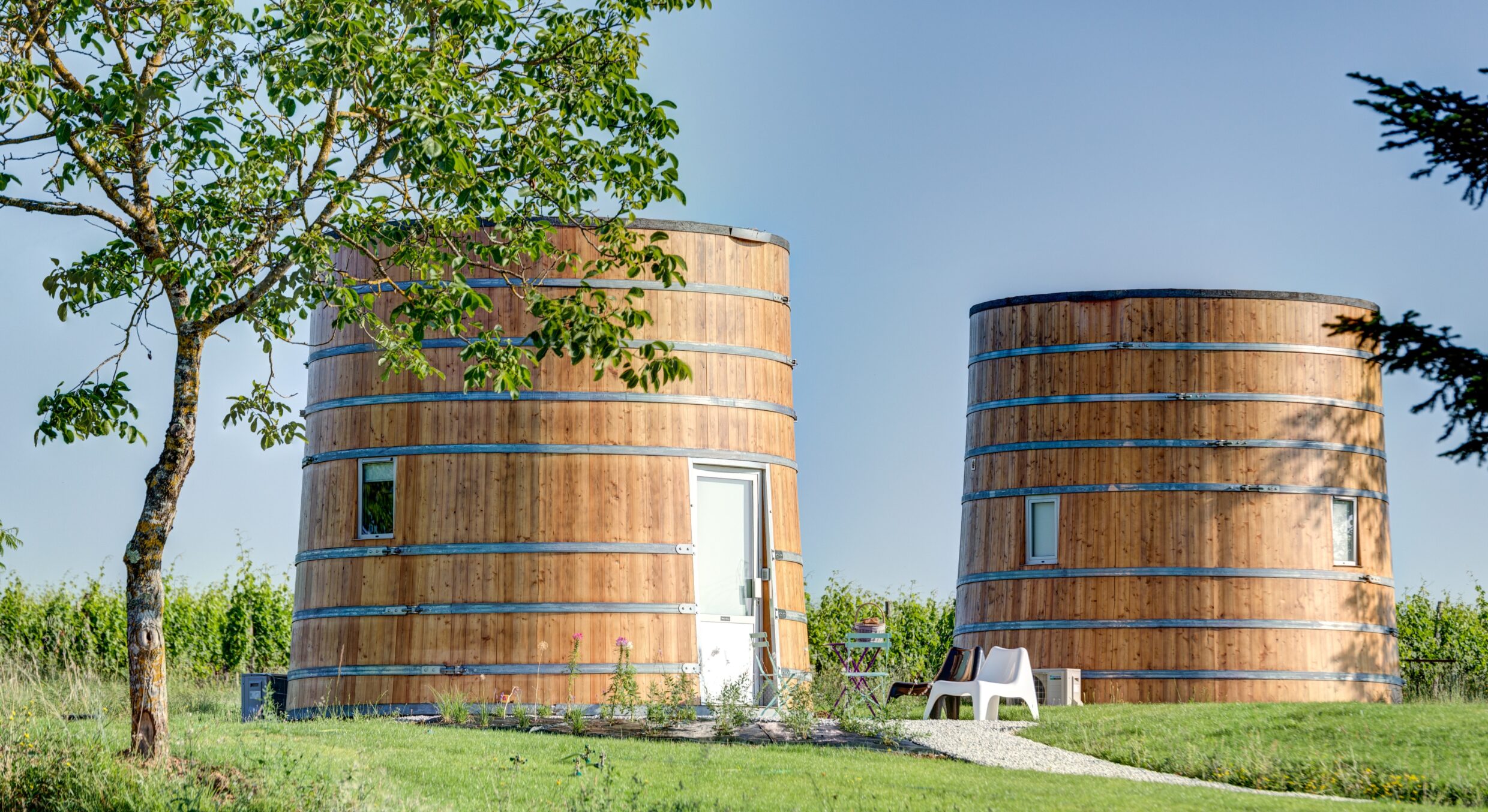 Nous vous proposons de séjourner dans de véritables foudres conçues par Seguin Moreau, expert en tonnellerie. Ces foudres servent habituellement à l’élevage et à la vinification des vins. Nous les avons aménagés exclusivement pour vous faire découvrir comment séjourner dans la région de Saint-Emilion de manière unique et insolite, sur la propriété du Château de Bonhoste, au milieu des vignes.