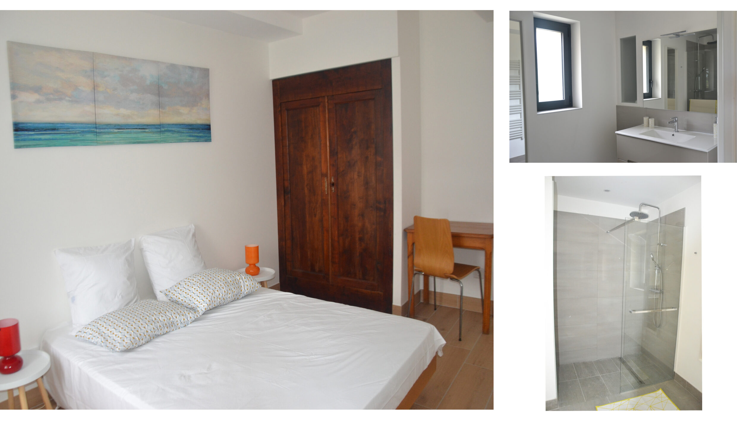 1 grande chambre au rez-de-chaussée,1 lit double en 160x200cm, salle d’eau, WC privatif