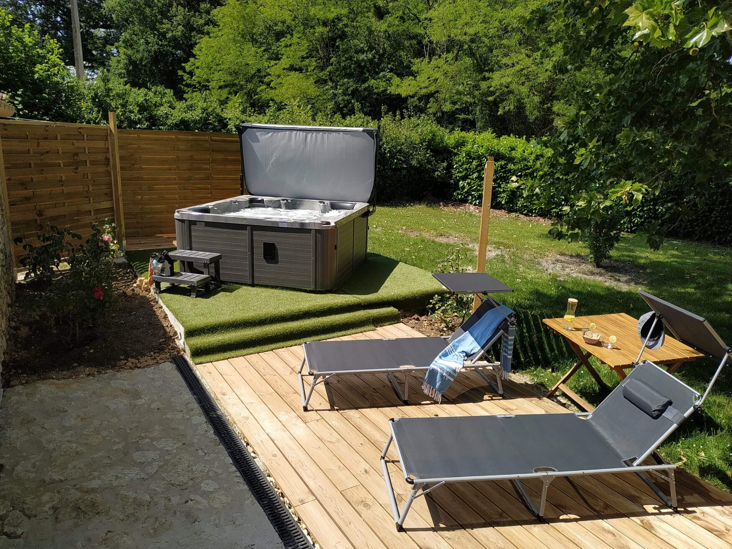 Le jacuzzi, abrité et en fonctionnement toute l’année, vous est entièrement dédié, accès privé à volonté de jour comme de nuit ! Aucun vis à vis. Deux terrasses bois privatives encadrent le gîte.