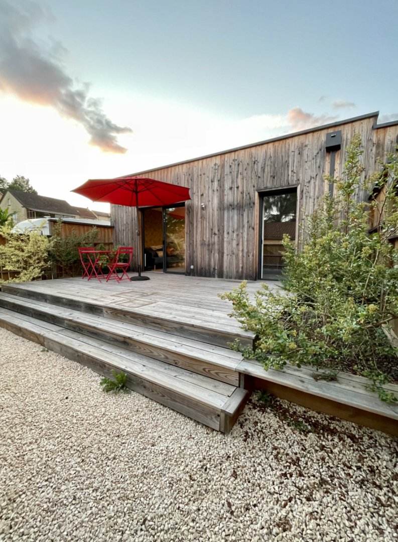 Grande terrasse en bois avec salon de jardin et barbecue.