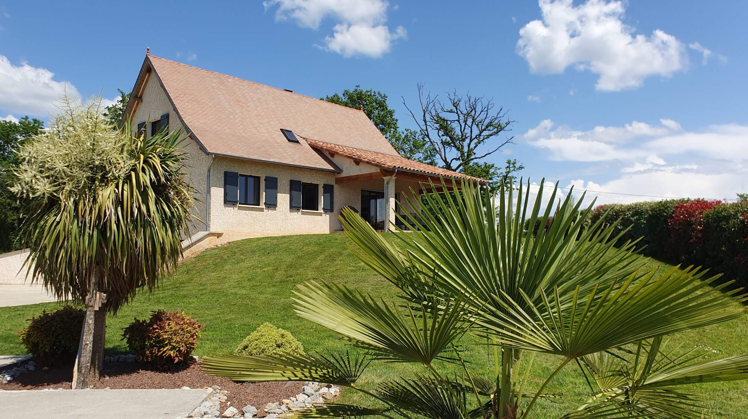 La terrasse couverte offre un joli panorama sur la campagne lotoise.