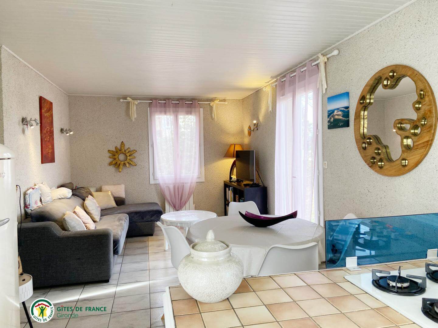 Cette maison indépendante dispose en rez-de-chaussée d’une pièce de vie avec coin salon (canapé convertible 140×190 cm), coin salle à manger et cuisine (lave linge, petit four grill, cuisinière 4 plaques gaz), d’une chambre en rez de chaussée avec un lit 140X190cm, penderie et rangement, d’une salle d’eau (douche avec rideau) et d’un wc indépendant. Accés à une mezzanine équipée d’un lit 140X190cm.