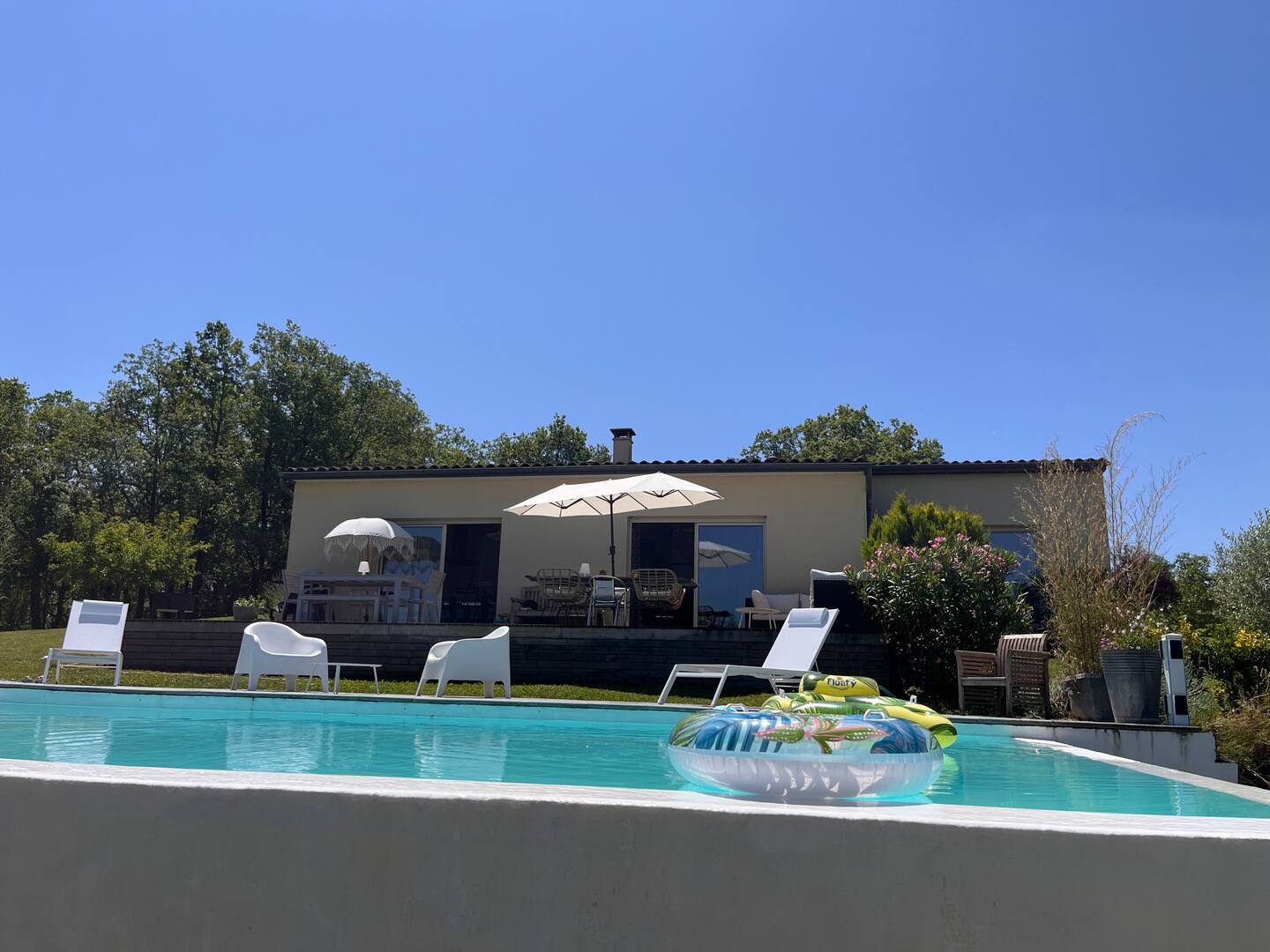 Sur les hauteurs de Domme, cette superbe maison offre une expérience rare : un panorama exceptionnel sur le château des Milandes depuis un parc privé de 4 hectares bordé de noyers.