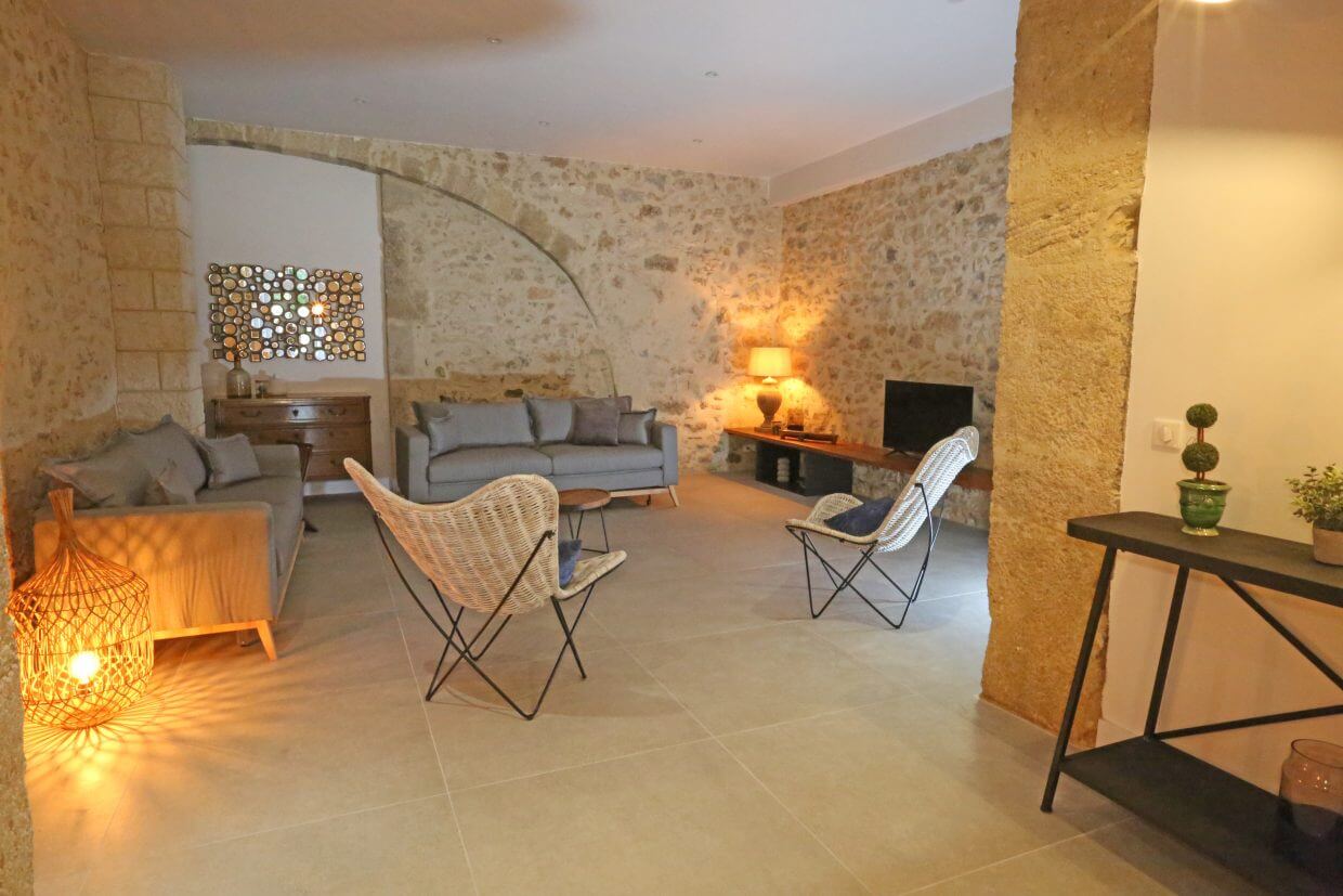 Magnifique gîte de 120 m², plain-pied et adapté PMR. Salon de 40 m² avec pierres apparentes et voûtes. Cuisine design ouverte sur une terrasse ombragée de 50 m². Deux chambres (lit double, lits superposés) et deux canapés convertibles. Parc avec fontaine pour un cadre paisible et relaxant.