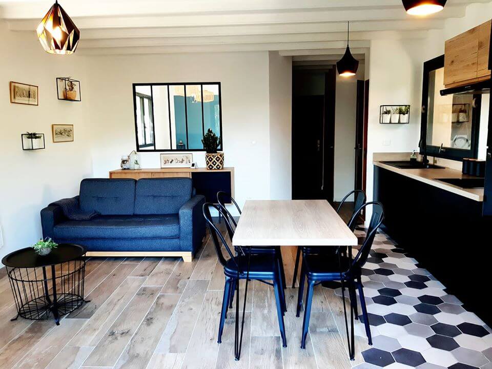 Appartement de 43 m2 avec balcon (accolée à la maison du propriétaire et d’un autre gite), situé en étage avec escalier, 1 chambre avec lit double et coin bureau, salon avec télé grand écran, Wifi, 1 canapé lit en 140, balcon avec table et chaises, cuisine équipée, salle de bain avec baignoire et vasque, WC séparé.