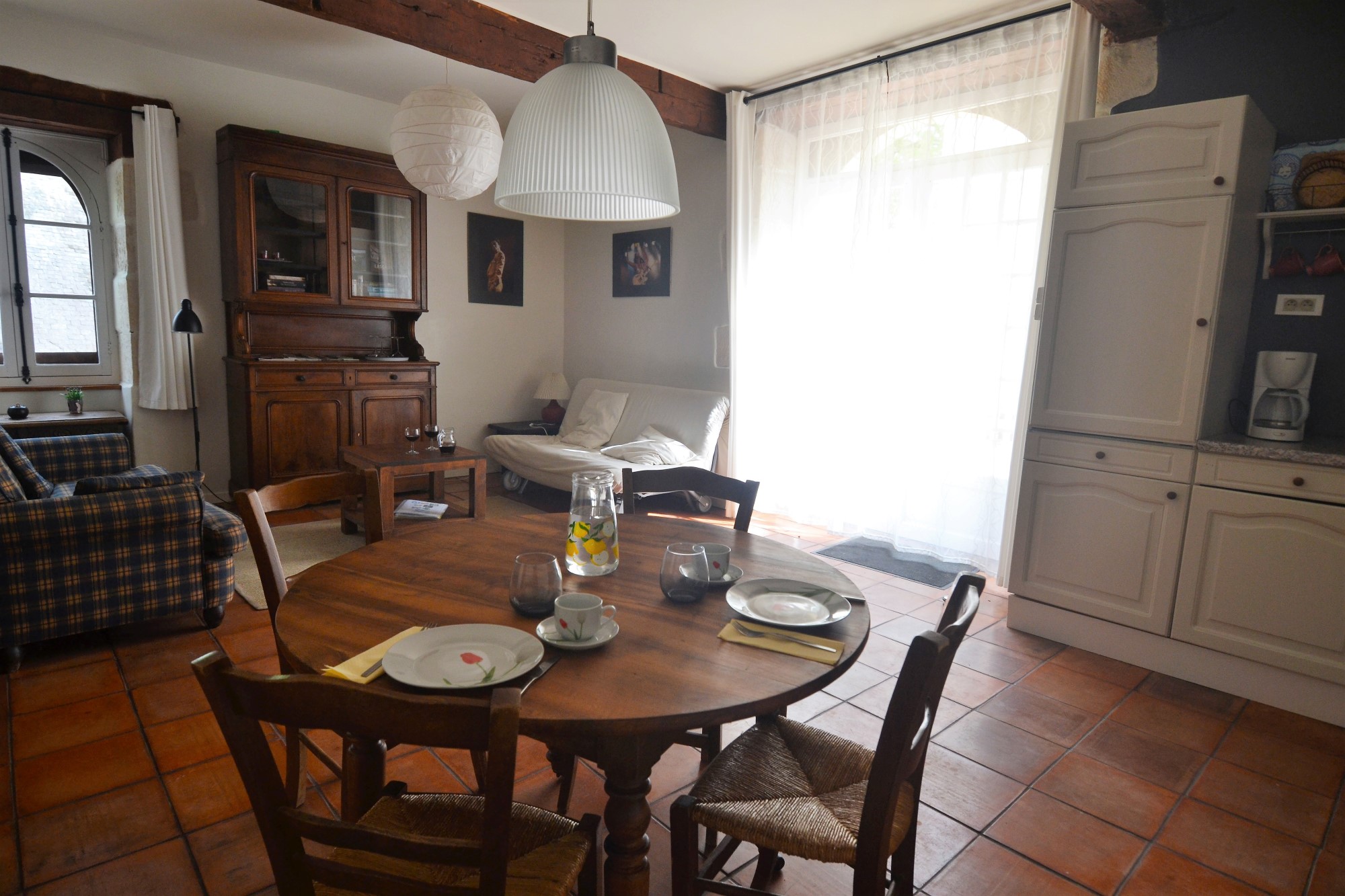 Une machine à laver commune est à votre disposition. Dans votre débarras il y a un séchoir à linge, une planche à repasser et un fer. Vous disposez d’une table et quatre chaises, un coin salon et une zone de couchage. La salle de bain est équipée d’une douche et un petit bain. Depuis la terrasse (avec table, parasol et barbecue) vous avez une vue sur la cour et la vallée verdoyante en façe du Manoir.