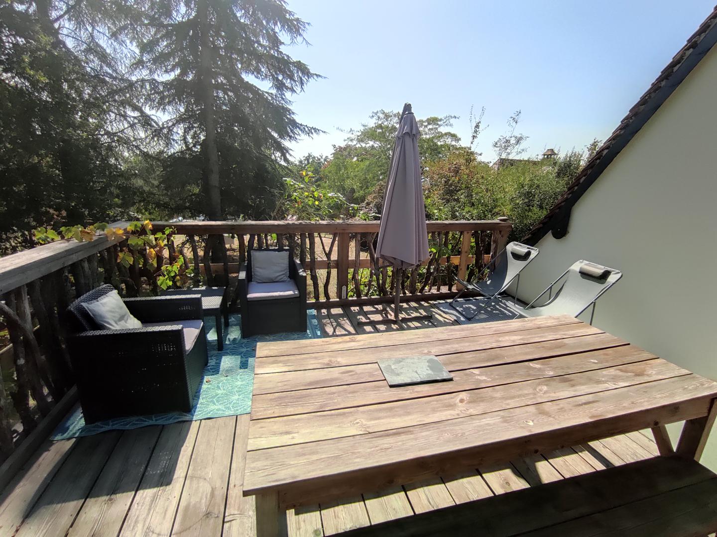 Le gite Aux champs des oiseaux est un appartement au 1er étage avec sa terrasse en bois est perché dans les arbres d’un jardin arboré et fleuri et donne vue sur la piscine.