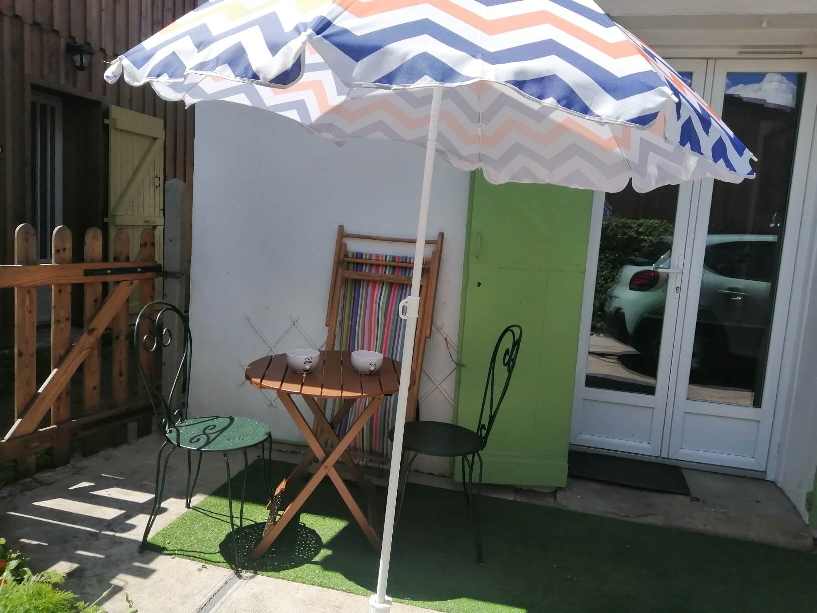 Vous entrez par une cour de 40 m2, cour fleurie, avec salon de jardin et possibilité de garer votre voiture. Cette cour vous amène dans la pièce à vivre : kitchenette avec frigo, mini-four, micro-ondes, petit coin salon, TV, table, chaises, fauteuil, transat. Quelques produits locaux vous attendent.