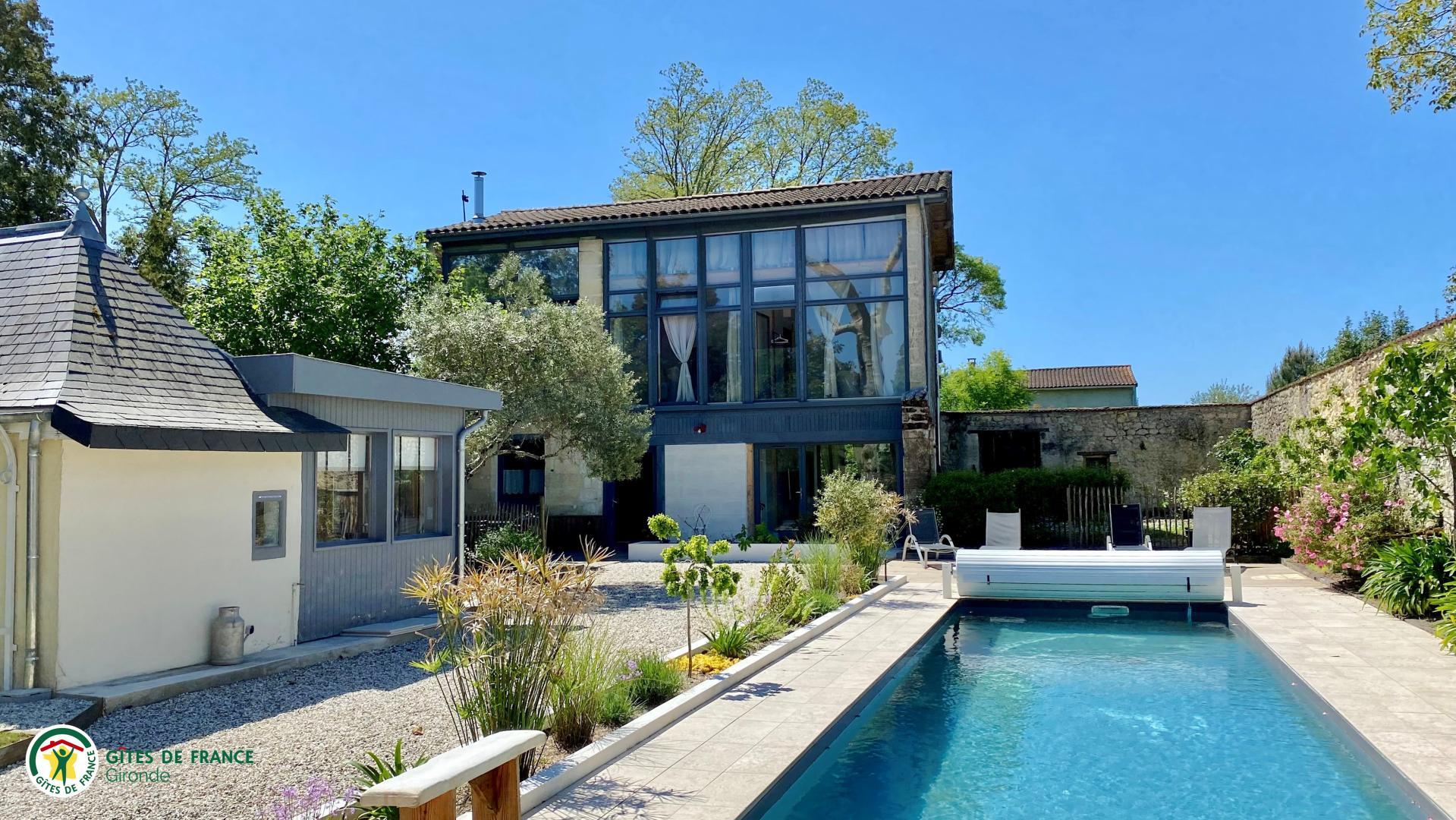 La grange se trouve à coté de la piscine partagée et à proximité immédiate du second gîte (terrasses respectives séparées par une clôture girondine et quelques plantations). Piscine chauffée ouverte et à disposition du 1er mai au 15 septembre, de 10h à 20h.