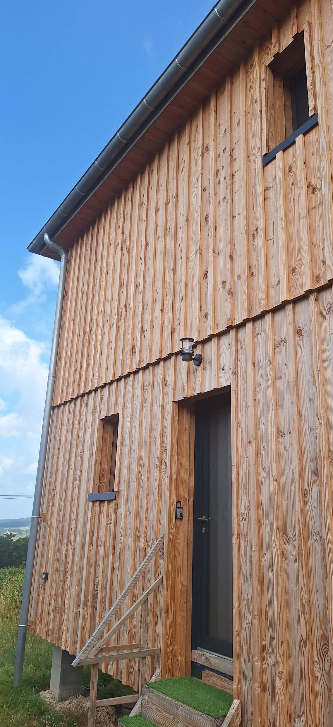 Maison insolite récente tout en bois, offrant un joli point de vue sur la vallée et située dans un quartier calme aux portes de Figeac proche de la RD reliant Figeac à Villefranche.