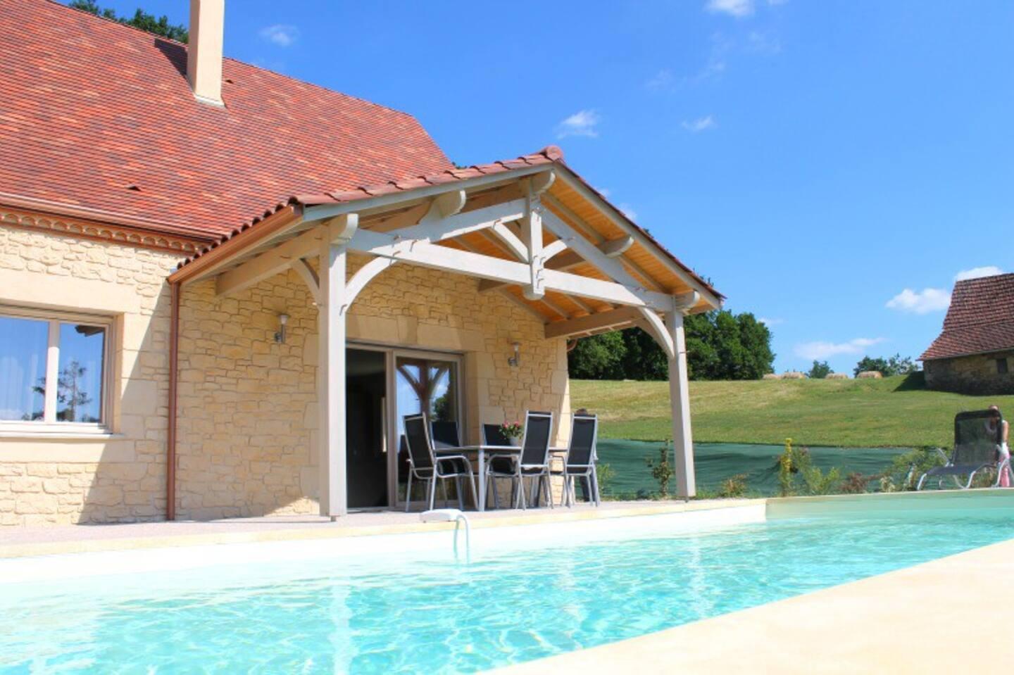 Située à seulement 2.9 km du centre-ville de Sarlat, sur les hauteurs avec vue panoramique sur la campagne Sarladaise depuis sa piscine.Agréable maison de vacances avec piscine privée chauffée du 01/05 au 03/10 et sécurisée par alarme (dim 7 x 3.5 m – prof 1.50 m + 3 marches). Belle et grande terrasse tout autour avec salon de jardin.Parking privé et terrain non clos tout autour – Accessibilité pour handicapés.Maison classée Energie A, chauffage aérothermique à énergie renouvelable, confort acoustique.Draps fournis – Chauffage comprisDe plain-pied: Une pièce principale avec cuisine intégrée,Un coin salon avec TV donnant accès à la terrasse,Une buanderie,Une suite parentale avec 1 lit 160 et sa salle d’eau privative avec douche et WC,Deux chambres avec 2 lits 140,Une salle d’eau avec douche à l’italienne,Un WC séparé.