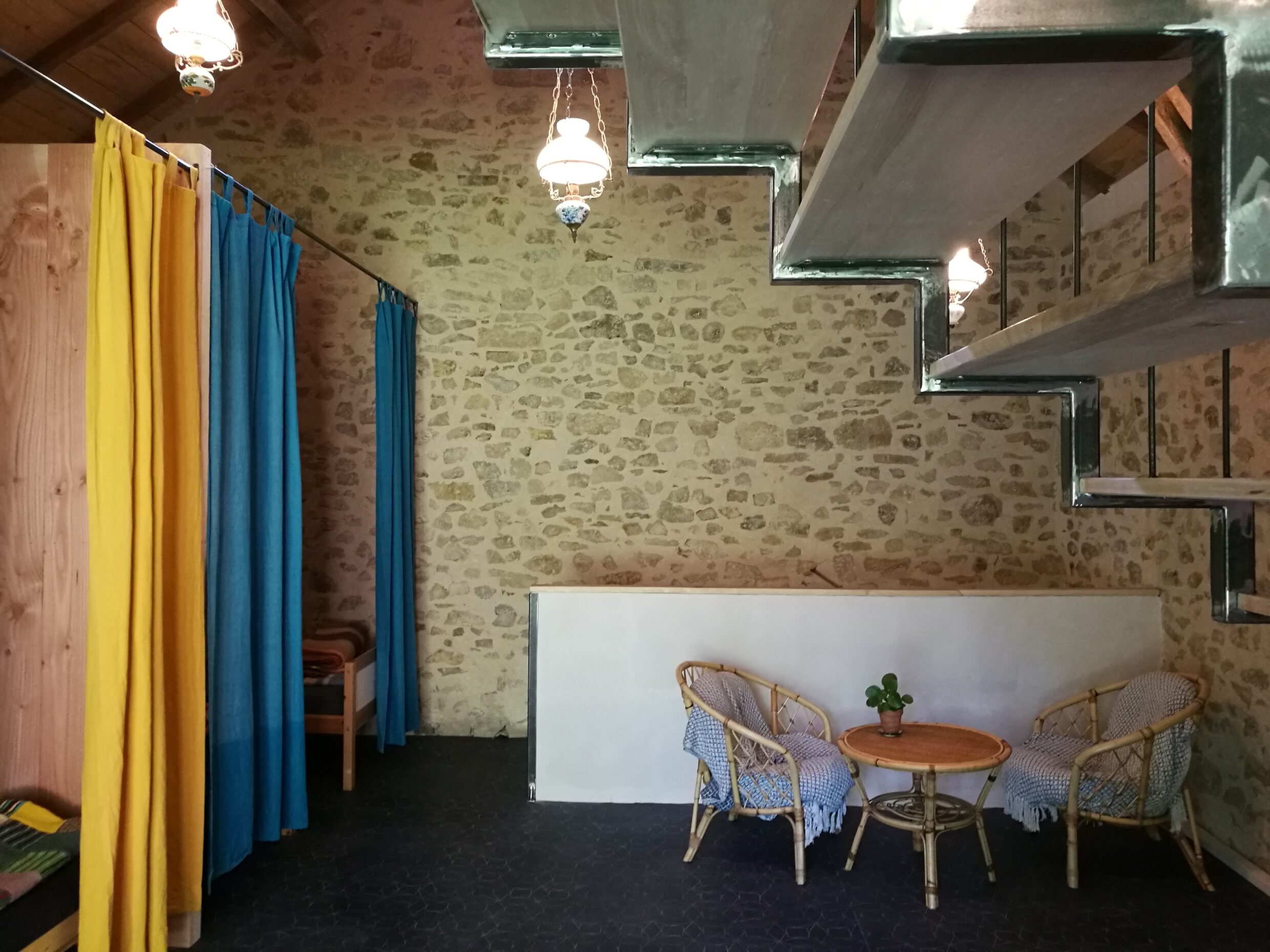 L’ accueil dans le gîte se fait à partir de 16h, espace pour sacs et chaussures à l’extérieur. Des alcôves de 2/3/4 places vous accueillent pour la nuit dans la bâtisse en pierre rénovée avec goût.