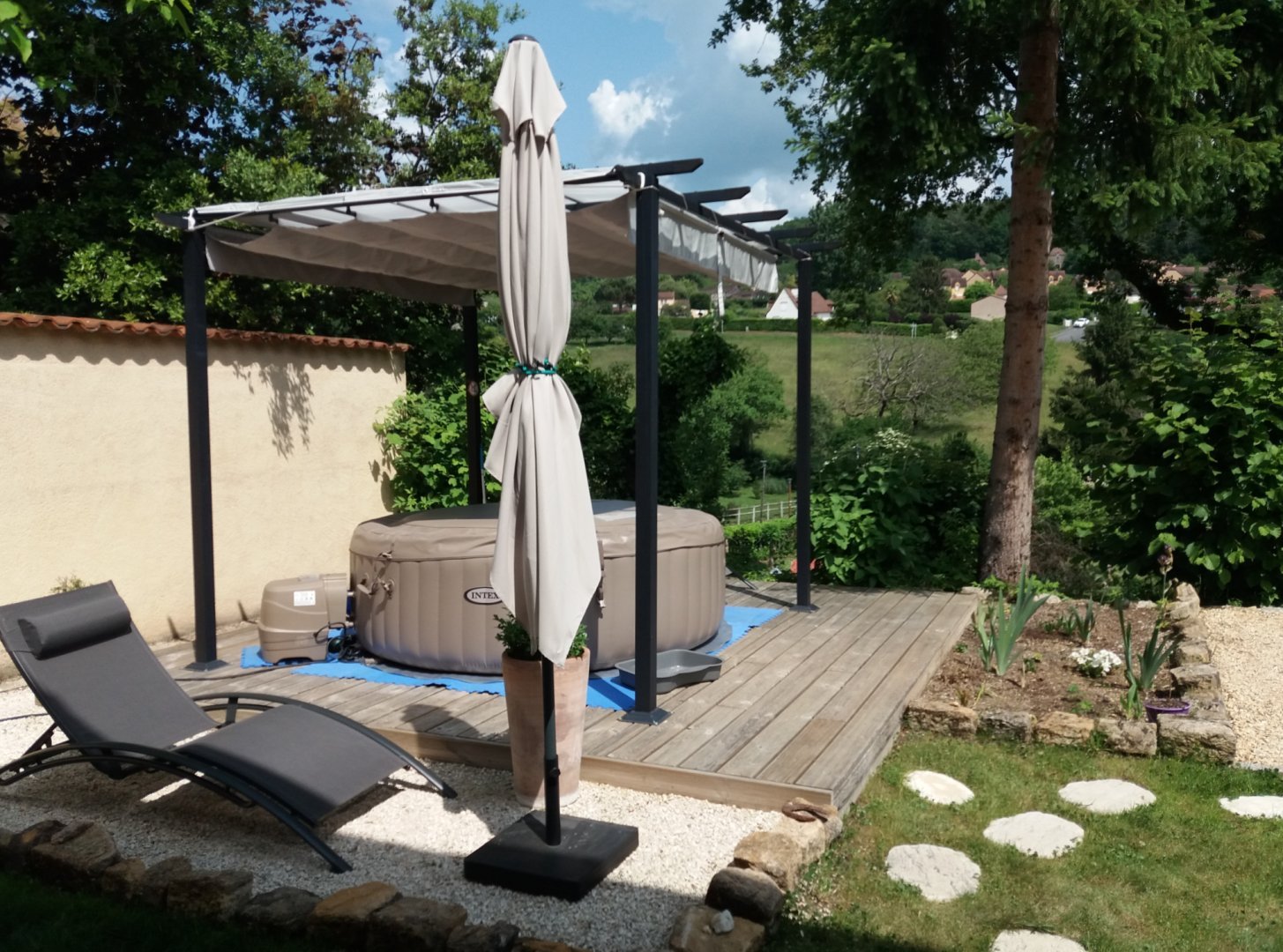 Location de vacances climatisée, pour 4 pers, avec spa gonflable tout neuf mis en place en raison de ces grosses chaleurs, à Sarlat, à 1.5 km du centre-ville, avec parking privé, terrain clos et terrasse couverte.