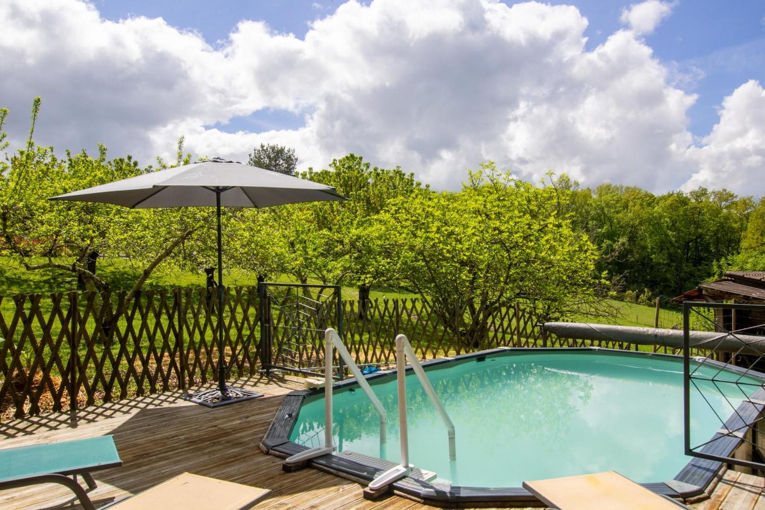 Piscine hors sol privative, sécurisée par une alarme, ouverte de juin à mi-septembre.