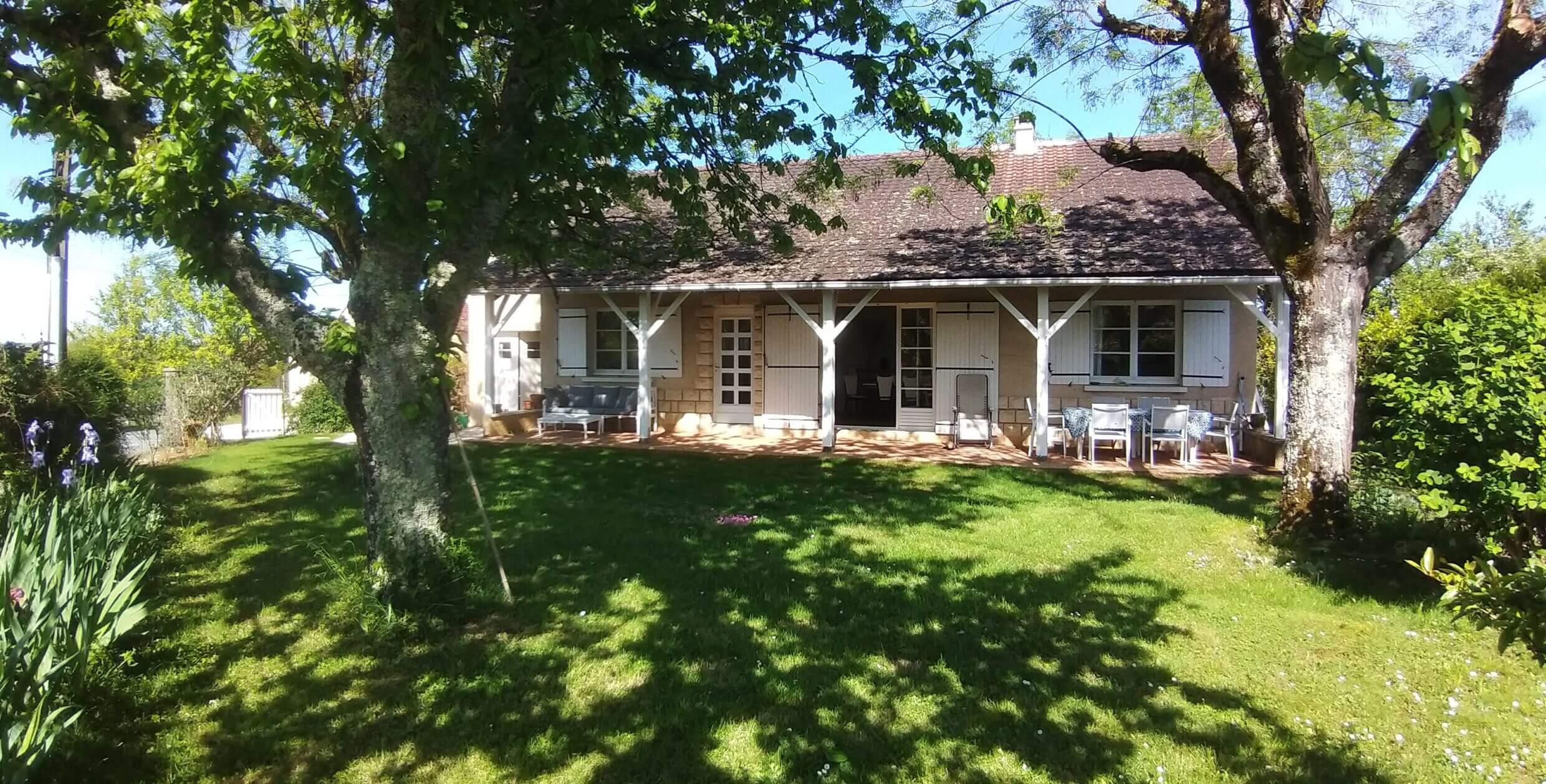La terrasse couverte est équipée d’une table et d’un salon de jardin.