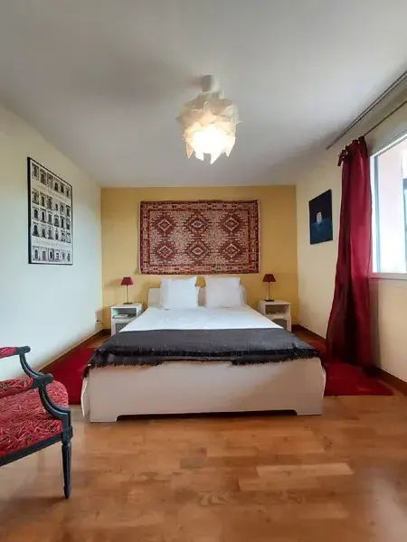Chambre à coucher 15m2 avec grand lit, draps de qualité, penderie.