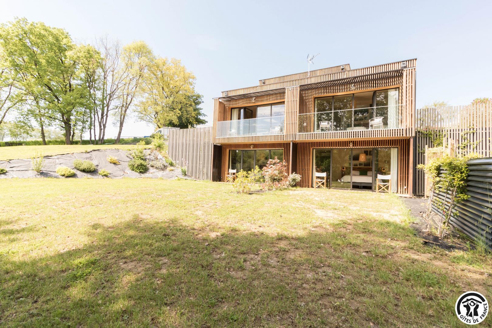 Dans cet écrin niché face à la forêt (chevreuils et biches s’y baladent), dans le charmant village de Gémil, vous entrez dans un univers cohérent et profondément ressourçant. La construction écoresponsable est au coeur du projet : panneaux solaires pour l’électricité et l’eau chaude, isolation naturelle en bois de peuplier et laine de roche, intégration paysagère avec des plantes locales soigneusement sélectionnées. L’atmosphère intérieure prolonge cette immersion avec une décoration inspirée de la forêt, chaleureuse et enveloppante.