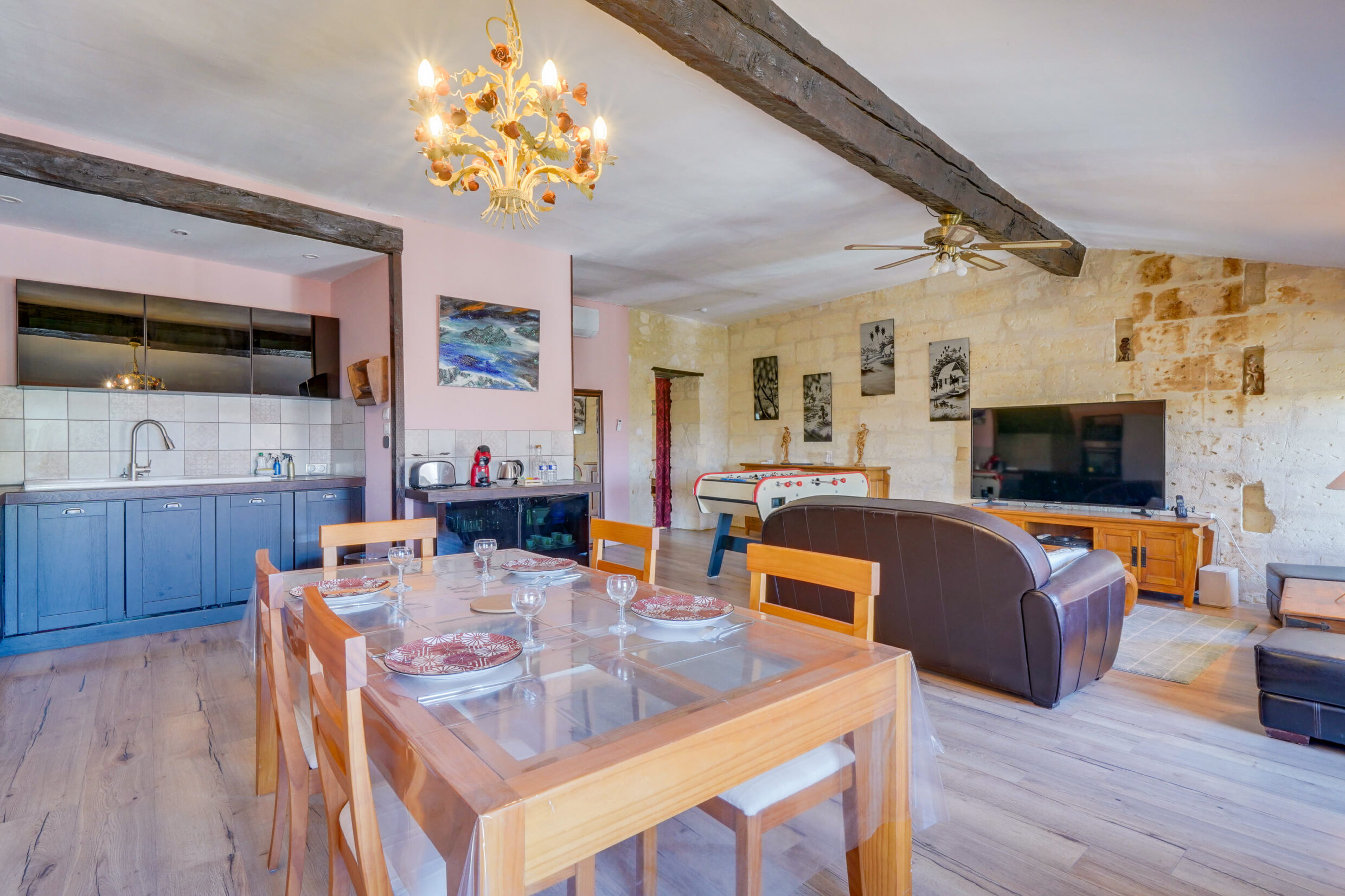 La cuisine ouverte sur la salle à manger est entièrement équipée. Le canapé du salon est convertible si nécessaire.