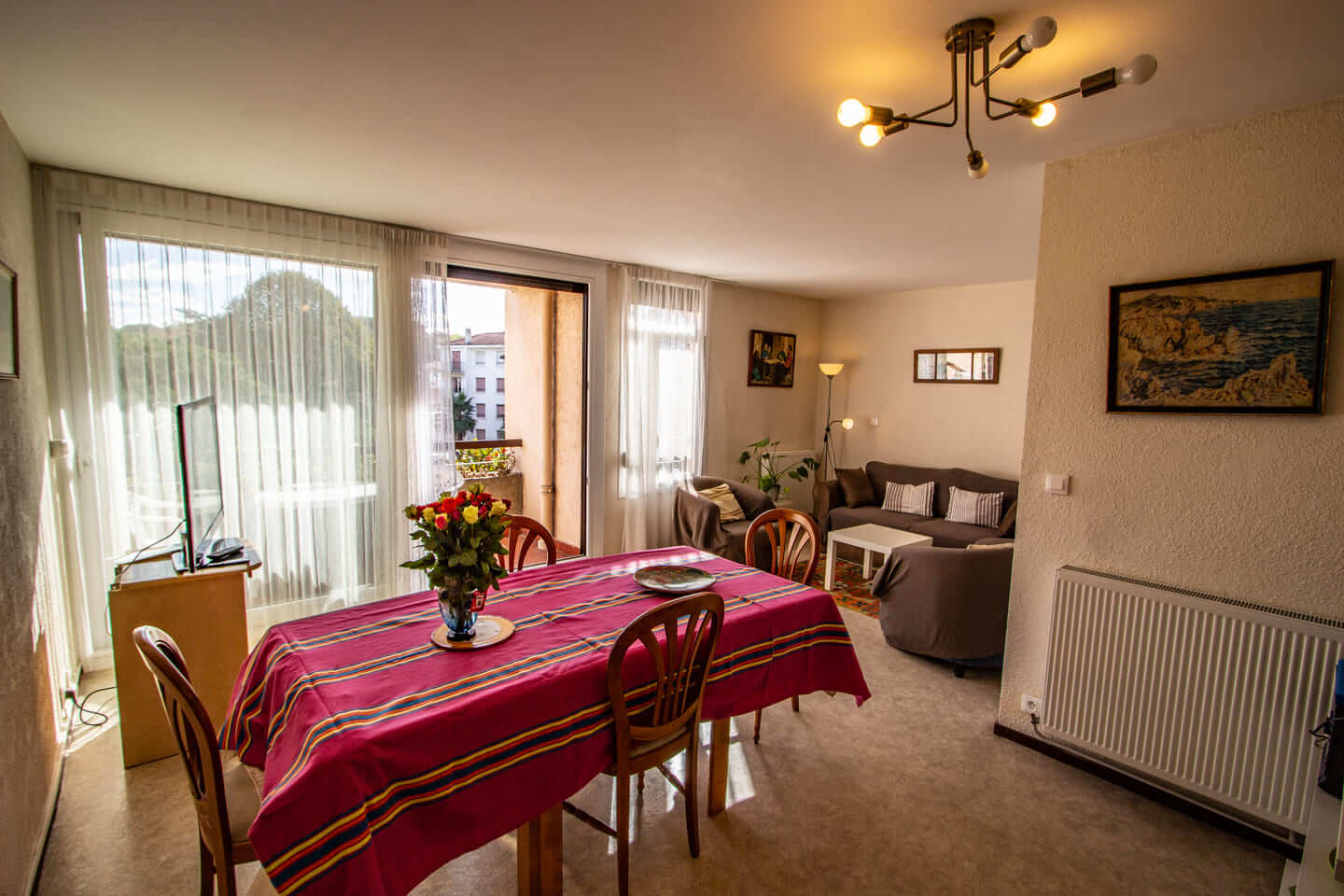Dans le séjour, un canapé-lit convertible, confortable, pour deux personnes. Grande table avec chaises, deux fauteuils et un salon de jardin sur le balcon, cuisine aménagée, salle d’eau avec baignoire. WC indépendant.