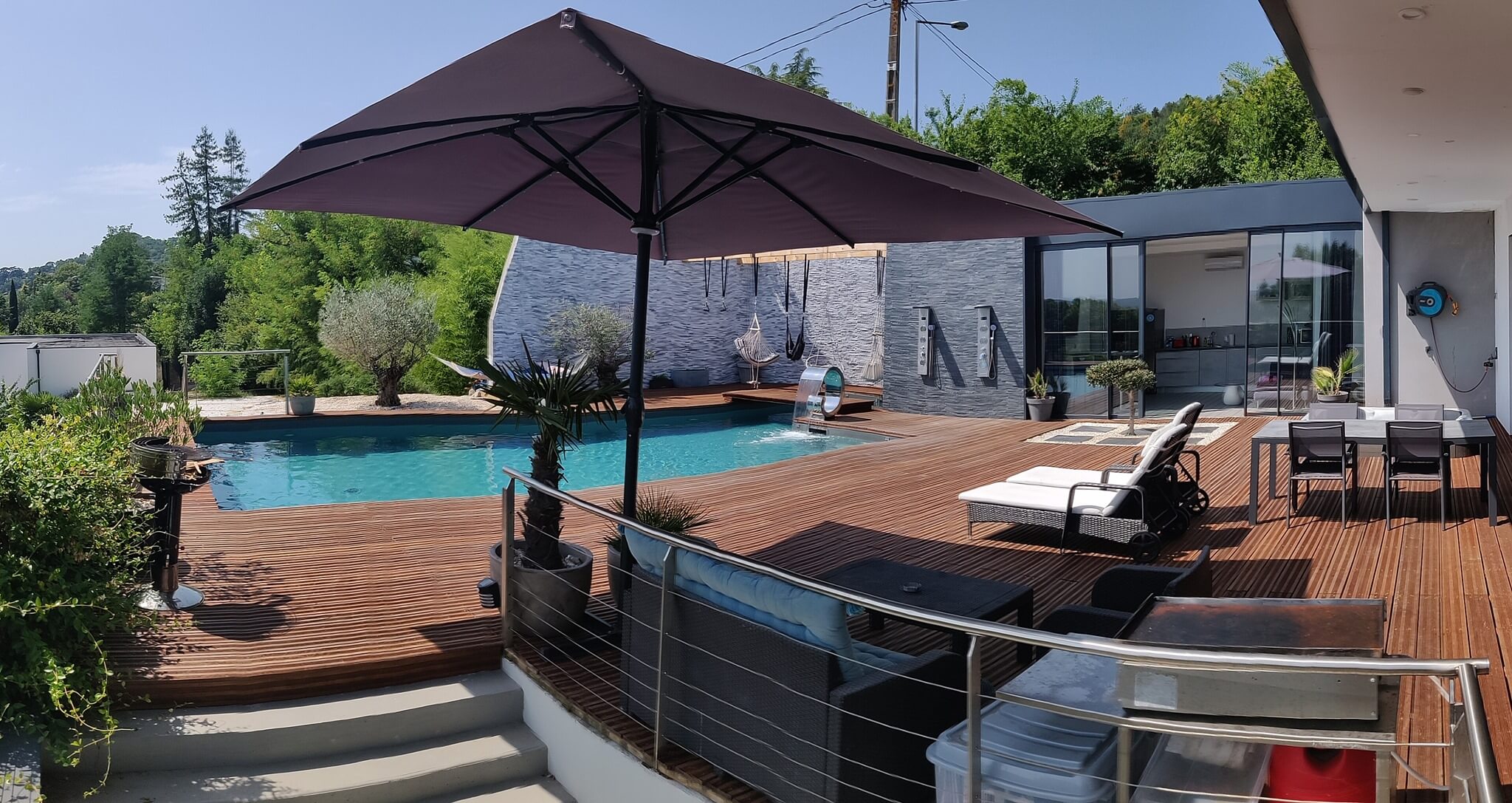Le séjour donne sur une grande terrasse en bois, bordant la piscine et offrant une vue imprenable sur la ville d’Agen. Le gîte est mitoyen avec la maison des propriétaires, qui vous laissent libre accès aux équipements de détente pendant votre séjour. Idéal pour la semaine ou le week-end, le gîte est à proximité du port d’Agen et de la gare, ainsi que de la voie verte du Canal.