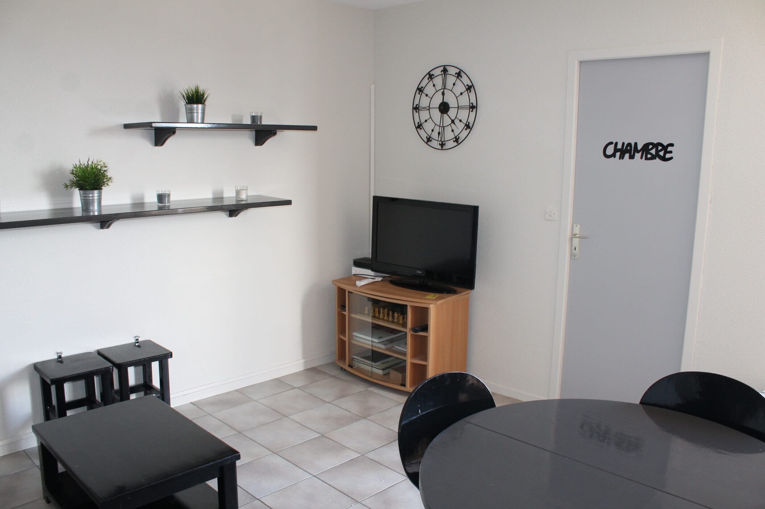 Une entrée avec grand placard, 1 salon de 20m² avec 1 canapé lit (capacité 2 personnes) donnant sur terrasse (possibilité de passer d’agréable repas (tables et chaises extérieures fournies), 1 chambre avec 1 lit superposé, 1 Chambre Parentale, 1 cuisine équipé avec four, four-micro-ondes, grand frigo, plaque 4 feux, lave vaisselle, cafetière, bouilloire, et nécessaire de cuisine. Puis une salle de bains avec douche refait a neuf. Un parking à 50m de l’immeuble, local à vélo et placard avec beaucoup de rangements. Non fourni draps: linge de toilette et de maison.
