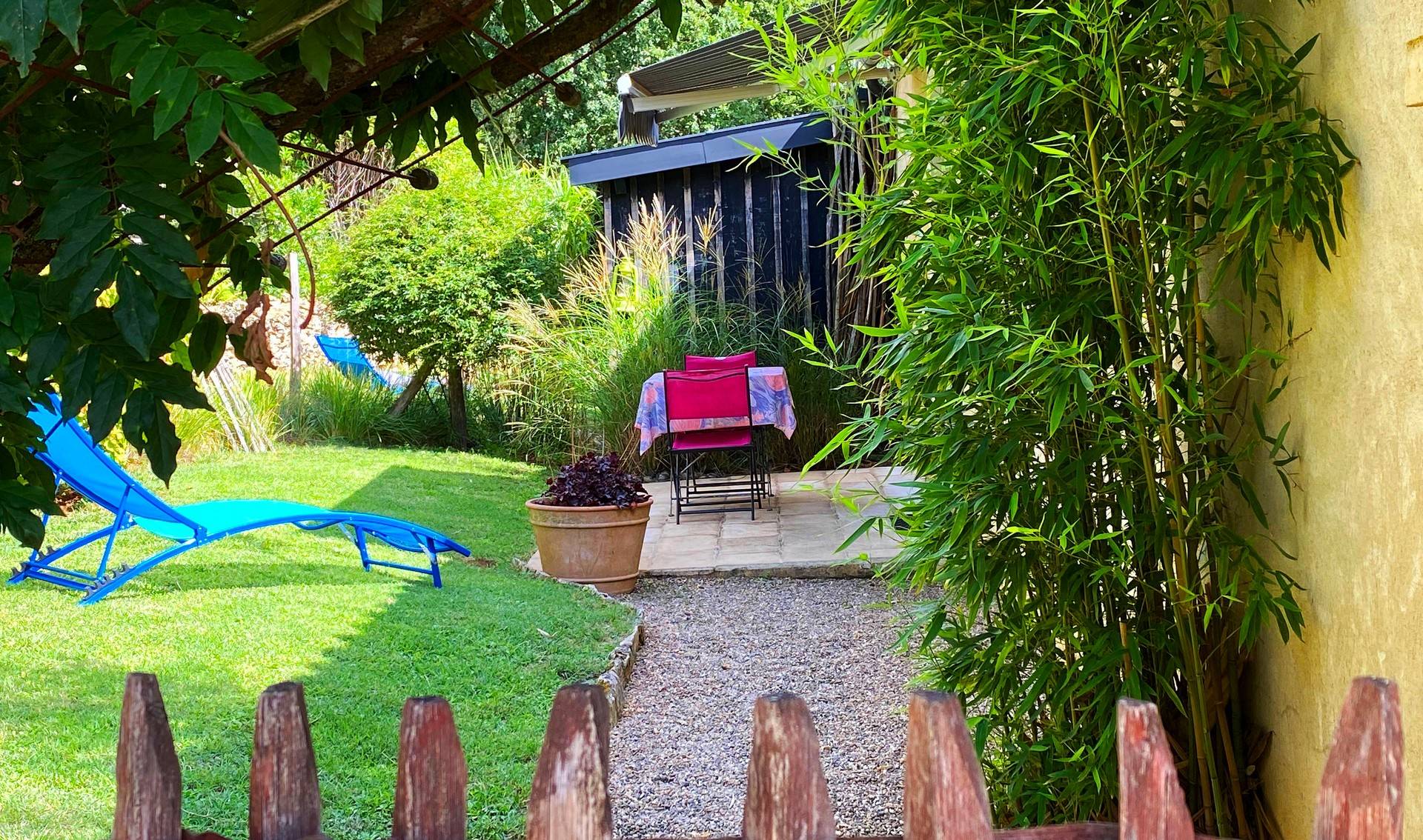 En point haut du Hameau, situés dans une bâtisse traditionnelle, cinq studios de plain-pied avec chacun sa terrasse couverte indépendante. Studio jardins avec une chambre en alcôve pour deux personnes dans un domaine composé de plusieurs autres locations au milieu d’une nature préservée.