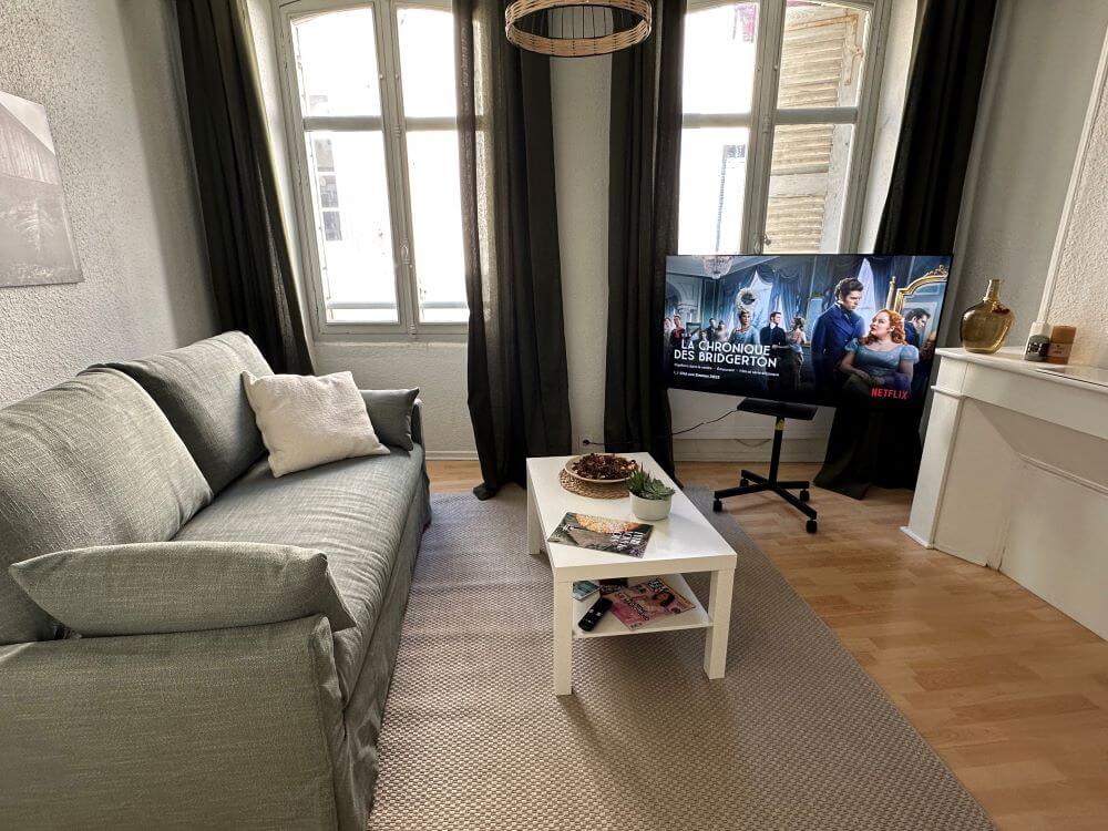 L’appartement : Situé au 1er étage, sans ascenseur, d’un immeuble ancien typique du centre-ville (sans ascenseur), La Sérénité a été rénovée avec soin pour allier charme et modernité.