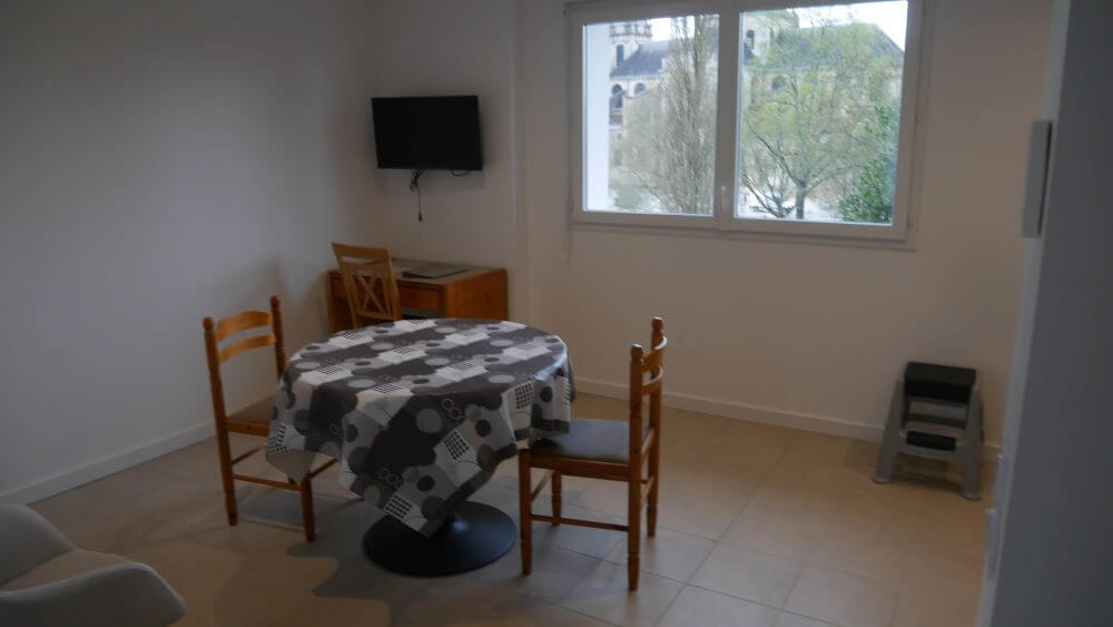 La pièce à vivre lumineuse est équipée d’un coin salon offrant une jolie vue sur la cathédrale et le jardin de la mairie et d’une cuisine entièrement aménagée, vous permettant de préparer vos repas en toute simplicité.