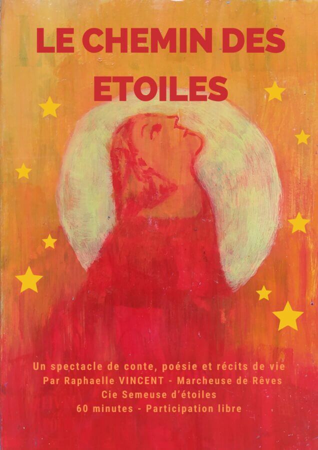 Chaque nuit, le même rêve revient : « Va sur le chemin de l’étoile, un trésor t’y attend ! ». Alors l’été 2022, l’artiste est partie à l’aventure sur les chemins de Compostelle à la rencontre de l’autre avec la question: « Et toi, c’est quoi ton rêve ? » Dans une approche spirituelle du pèlerinage, avec les rêves, les mots, les saveurs et les couleurs collectées, elle créé un spectacle en hommage à l’étoile qui nous guide.
